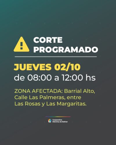 La Cooperativa Eléctrica de Bolívar anunció para hoy un corte programado para zona de Barrio Barrial Alto, de 08:00 a...