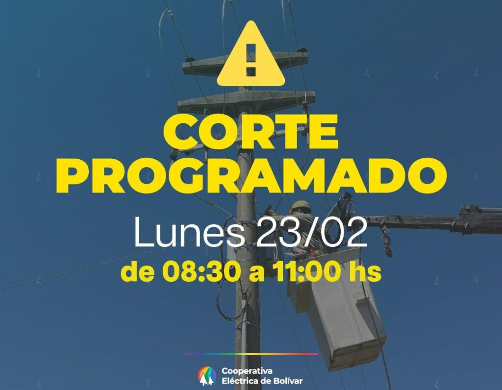 La Cooperativa Eléctrica de Bolívar anunció un corte programado para este lunes 23/02 08:30 a 11:00 horas en zonas periurbanas....