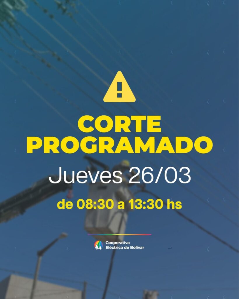 La Cooperativa Eléctrica de Bolívar informó que tiene previsto realizar un corte en el servicio este jueves 26/03 de 08:30...