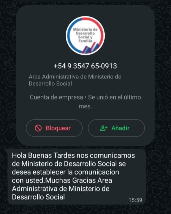 ADVIERTEN SOBRE INTENTOS DE ESTAFA CON SUPUESTOS CONTACTOS DEL MINISTERIO DE DESARROLLO SOCIAL