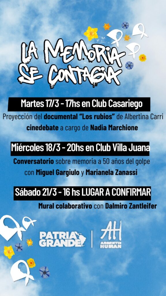 La agenda se inicia hoy martes 17, a las 17 horas en el Club Casariego, con la proyección del documental “Los rubios”, de Albertina Carri, seguida de un cine-debate coordinado por Nadia Marchione. En tanto, el miércoles 18 a las 20 horas, en el Club Villa Juana, se llevará a cabo un conversatorio sobre memoria a 50 años del golpe, con la participación de Miguel Gargiulo y Marianela Zanassi.