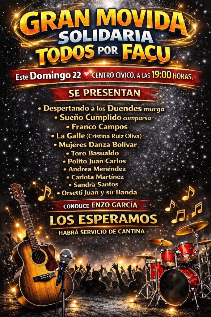 La gran movida solidaria “Todos por Facu”, que en principio iba a realizarse el domingo 15, fue reprogramada debido a la modificación en el calendario de Carnaval. De esta manera, el evento se llevará a cabo el domingo 22 de febrero a las 19 horas en el Centro Cívico, con entrada libre y gratuita, en una convocatoria que busca reunir a la comunidad en apoyo al joven Facundo Obregoso. Ya se definió la extensa lista de artistas que actuarán esa noche.