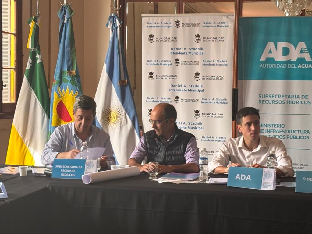 Participaron del encuentro los intendentes Daniel Stadnik (Carlos Casares), María José Gentile (9 de Julio), Ramiro Egüen (25 de Mayo), Alberto Gelené (Las Flores) y Maximiliano Sciaini (Roque Pérez), junto a representantes de la Dirección Provincial de Hidráulica y Autoridad del Agua.