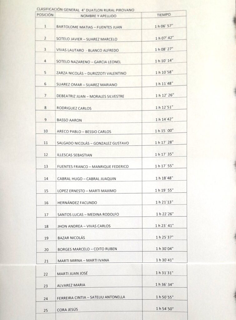 El primer puesto fue para la dupla integrada por Matías Bartolomé y Juan Fuentes, con un tiempo de 1h 06’57”. Bartolomé, oriundo de Pirovano y actualmente radicado en 9 de Julio, compartió la victoria con su compañero, también proveniente de esa ciudad.
