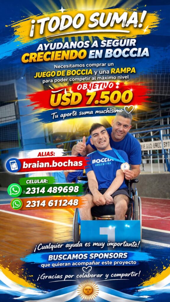 Se puso en marcha una campaña solidaria para acompañar al deportista bolivarense Braian Gutiérrez, quien compite a nivel nacional en boccia, con el objetivo de reunir fondos que le permitan adquirir equipamiento específico y continuar su desarrollo deportivo. La iniciativa apunta a alcanzar los 7.500 dólares para la compra de un juego de boccia y una rampa, elementos fundamentales para competir al máximo nivel.