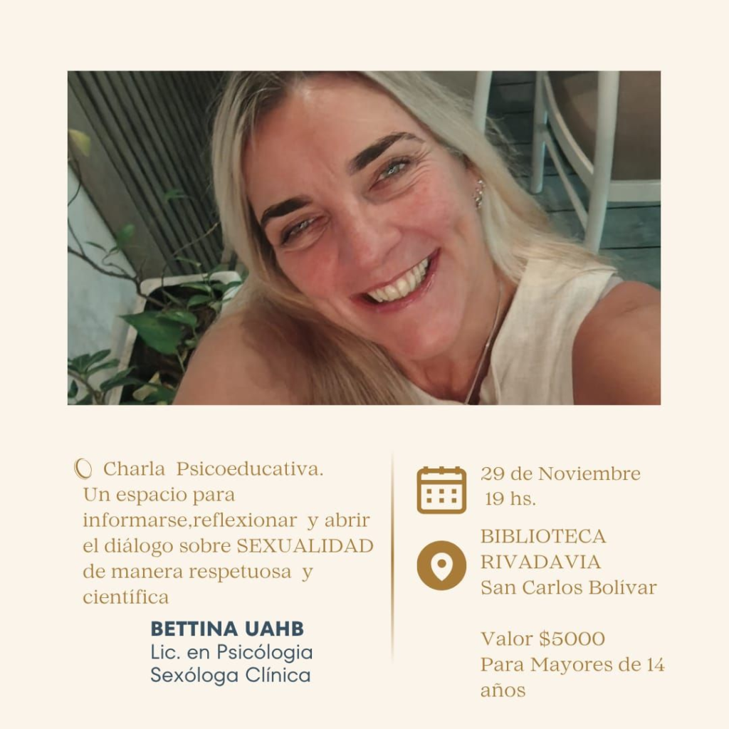 La Biblioteca Rivadavia recibirá este sábado a las 19 a la licenciada en Psicología y sexóloga clínica Bettina Uahb, oriunda de 9 de Julio, quien brindará una charla psicoeducativa abierta a la comunidad. Anticipó que se hablará sobre sexualidad y autoestima, respeto por la diversidad y otros tópicos vinculados. La actividad está dirigida a hombres y mujeres mayores de 14 años, con un valor de entrada de 5.000 pesos.