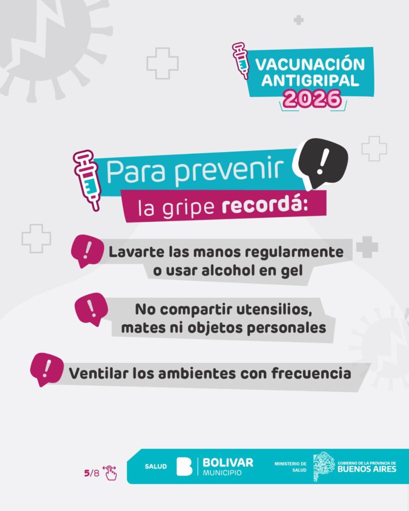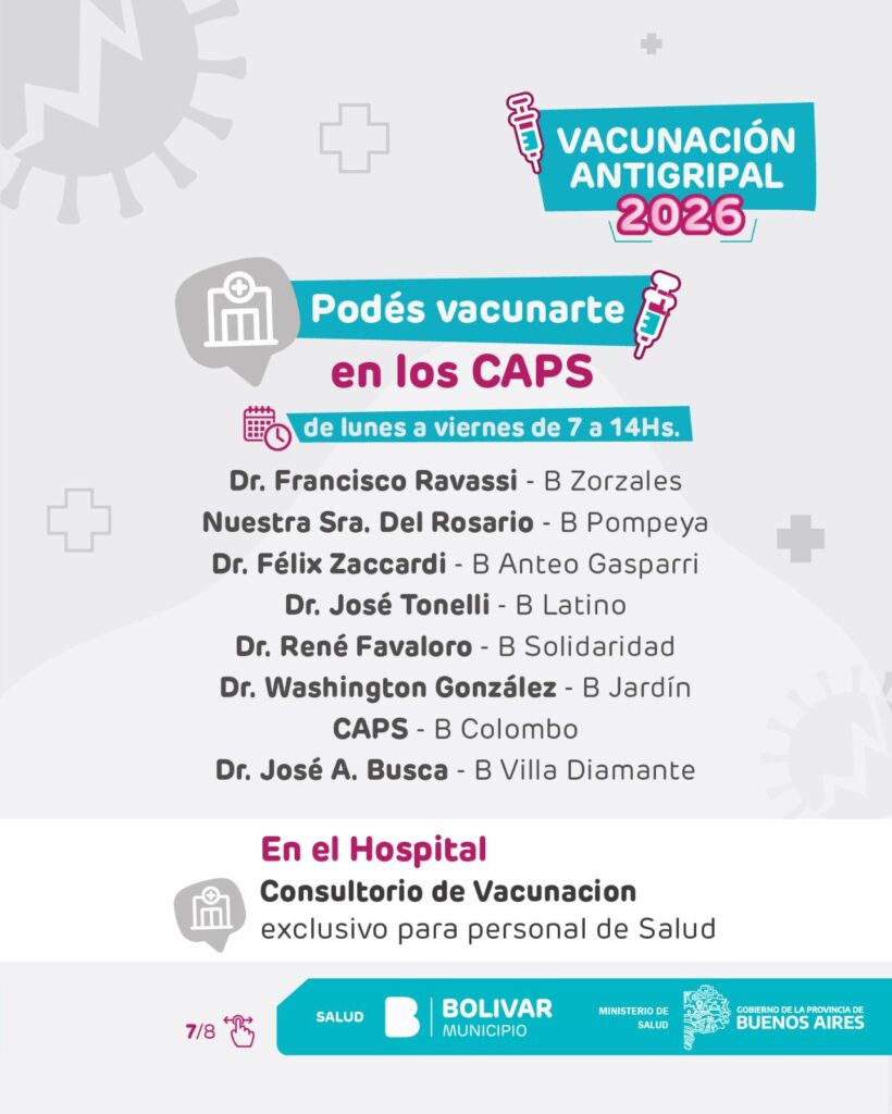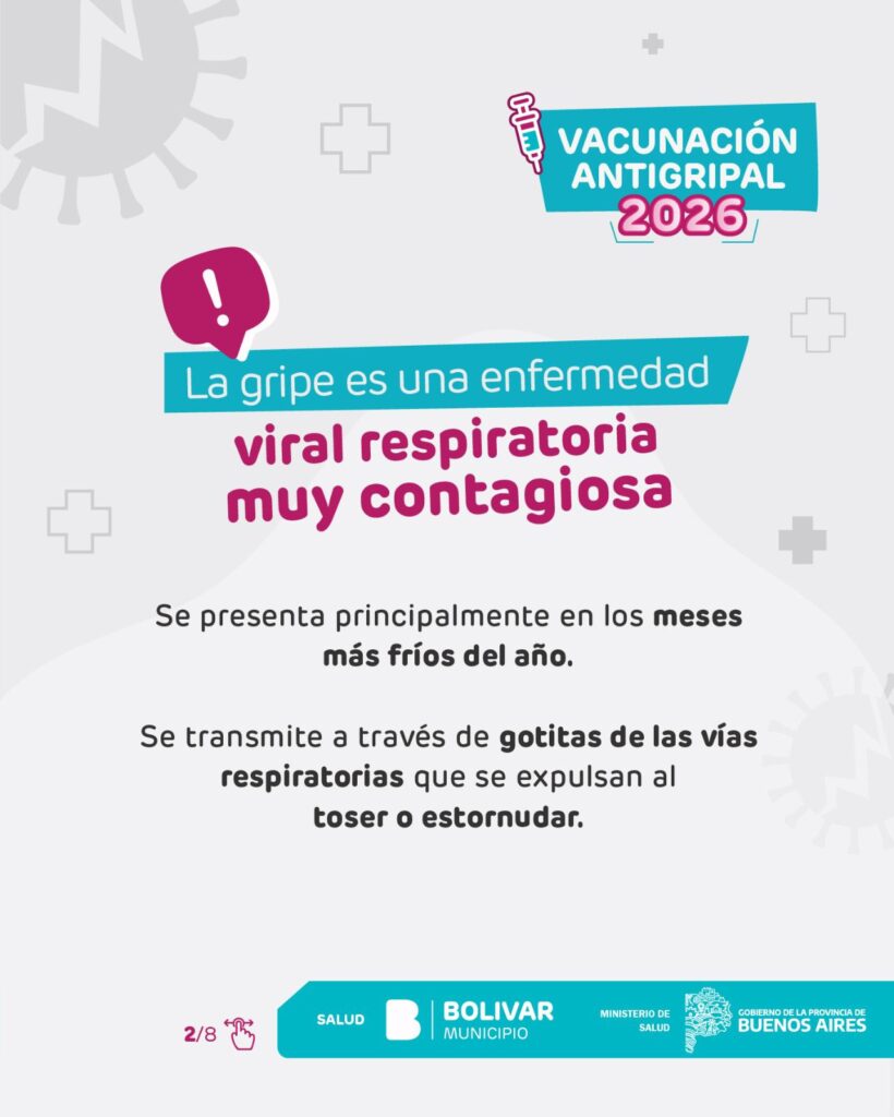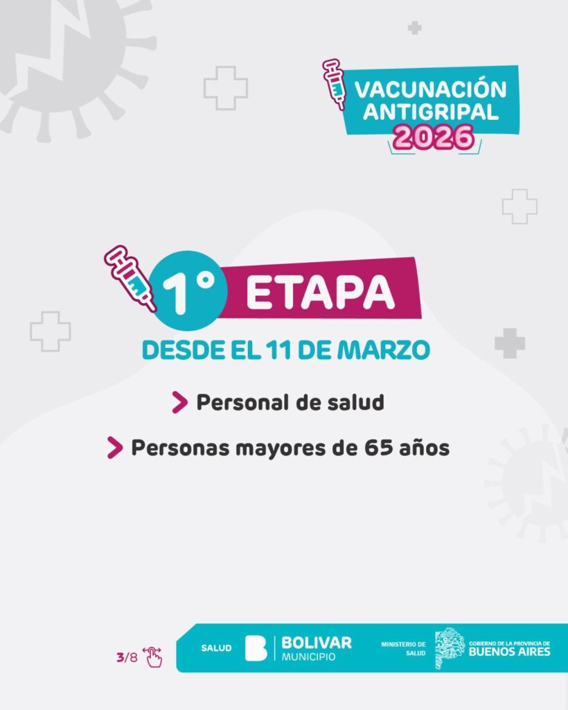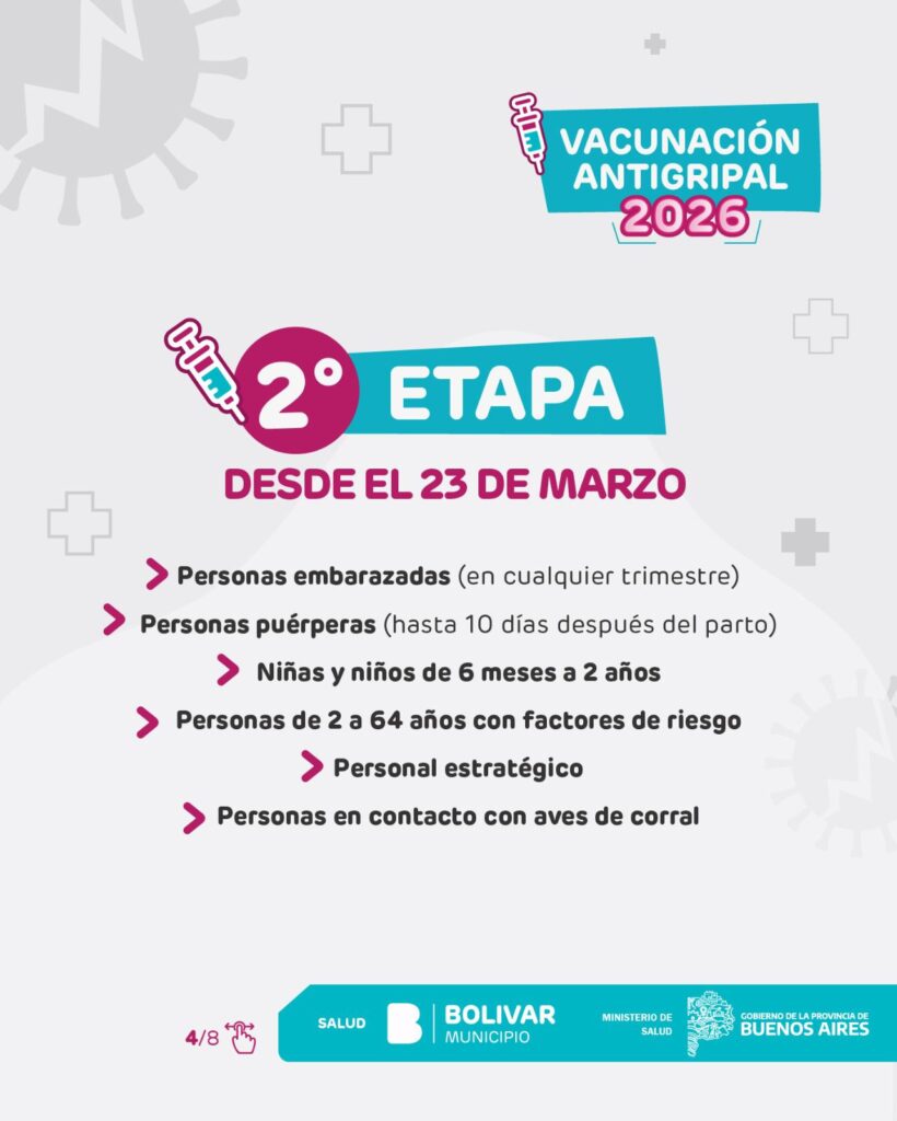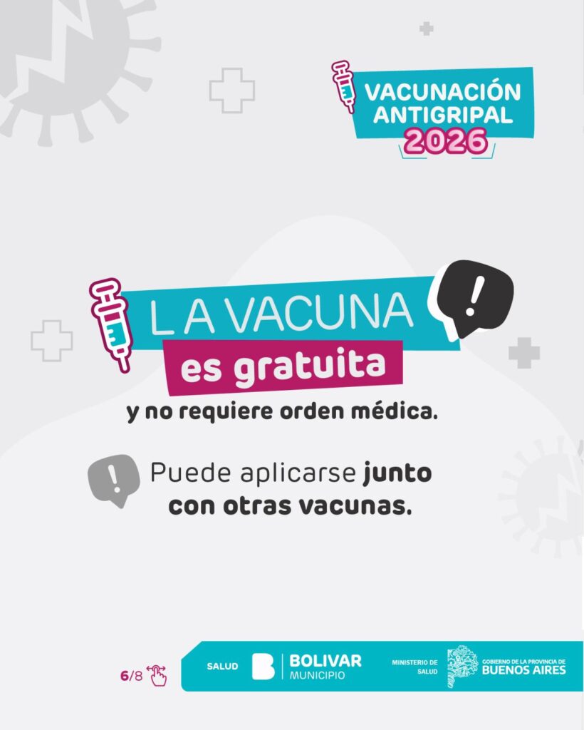Parte de prensa – El Municipio de Bolívar informa que ya se encuentra en marcha la Campaña de Vacunación Antigripal 2026, impulsada por el Ministerio de Salud de la Provincia de Buenos Aires. La estrategia de inmunización se desarrolla de manera gratuita y escalonada, priorizando a los grupos que presentan mayor riesgo de desarrollar complicaciones frente a la gripe.