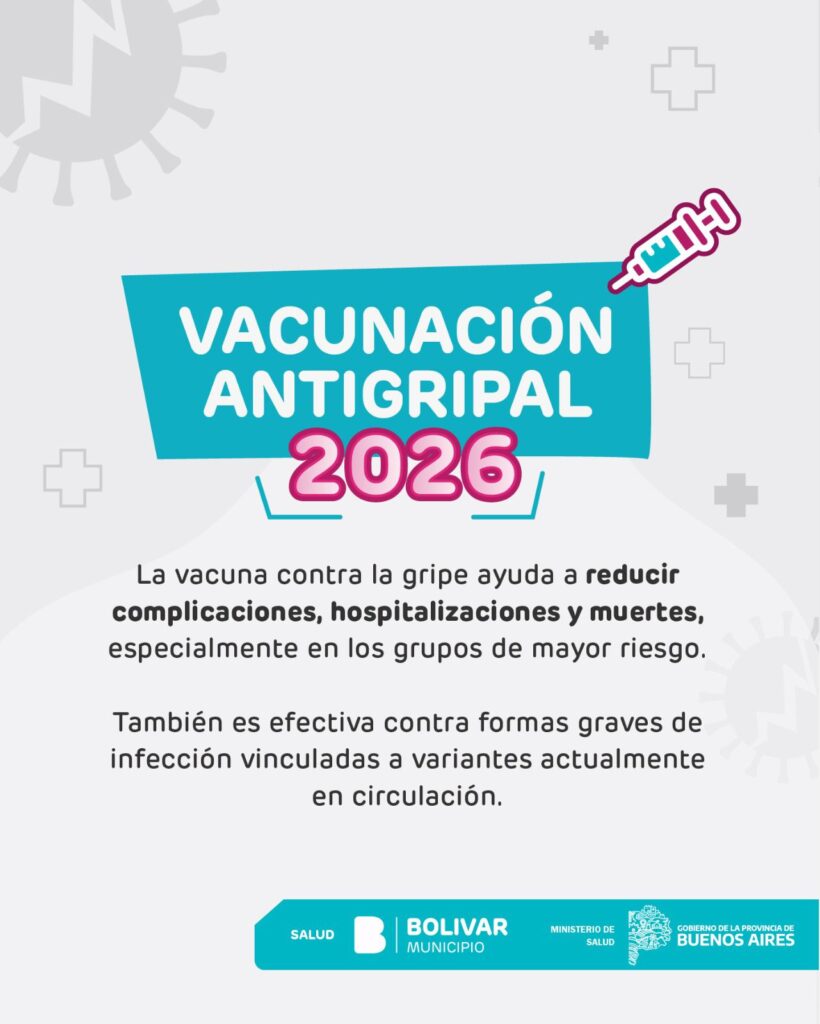 Parte de prensa – El Municipio de Bolívar informa que ya se encuentra en marcha la Campaña de Vacunación Antigripal 2026, impulsada por el Ministerio de Salud de la Provincia de Buenos Aires. La estrategia de inmunización se desarrolla de manera gratuita y escalonada, priorizando a los grupos que presentan mayor riesgo de desarrollar complicaciones frente a la gripe.