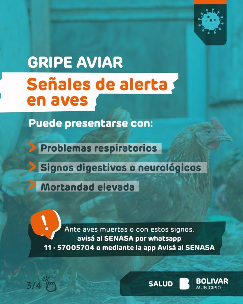 Parte de prensa – La Municipalidad de Bolívar informa que el Servicio Nacional de Sanidad y Calidad Agroalimentaria (SENASA) confirmó la detección de casos de Influenza Aviar (Gripe Aviar) en aves de corral dentro del partido. Ante esta situación, se activaron de inmediato los protocolos sanitarios correspondientes.