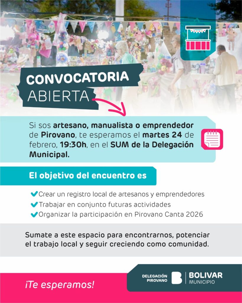 El objetivo de la reunión será conformar un registro local de artesanos y emprendedores, coordinar futuras actividades conjuntas y comenzar a organizar la participación en el evento Pirovano Canta 2026.