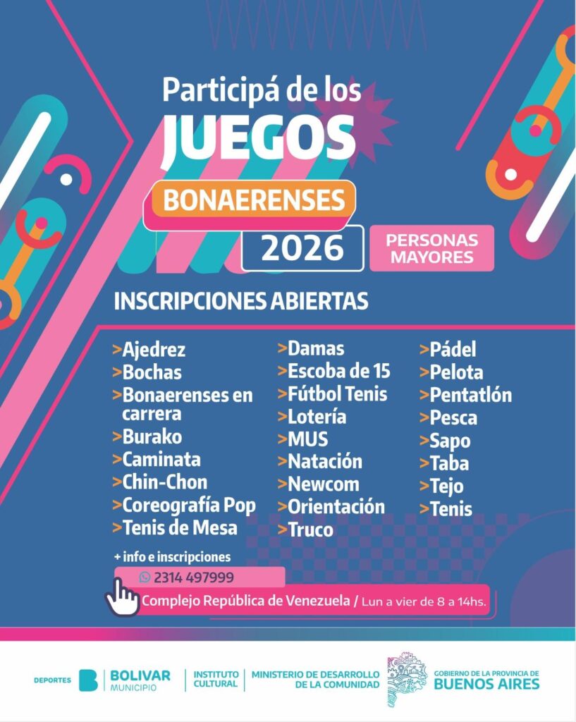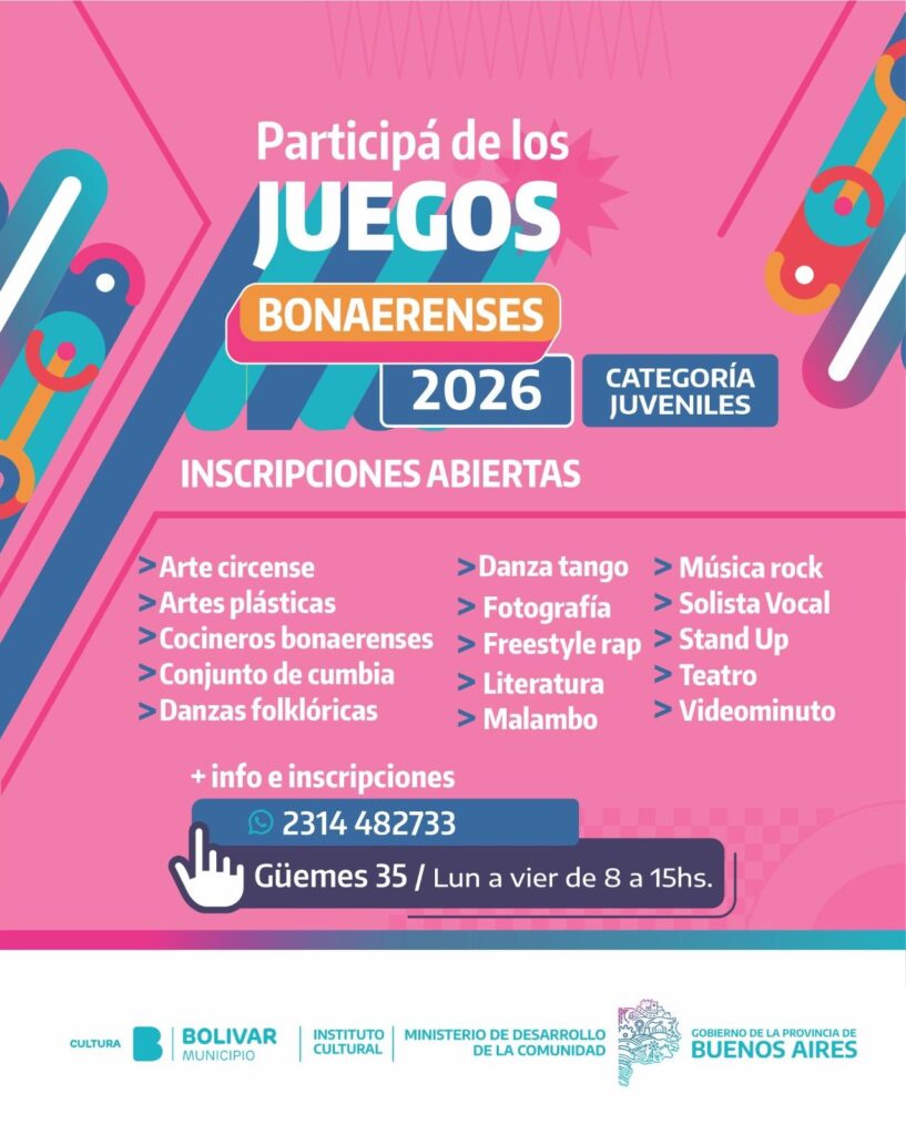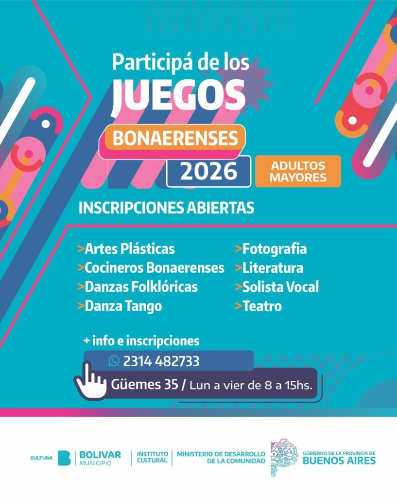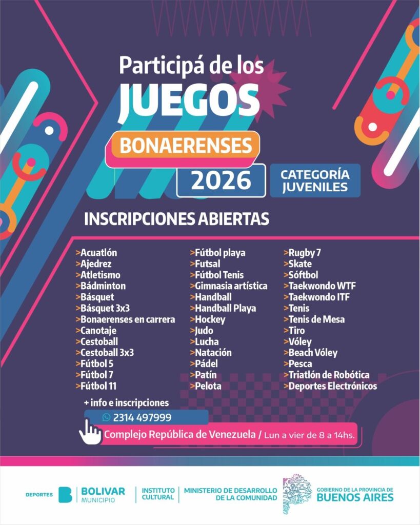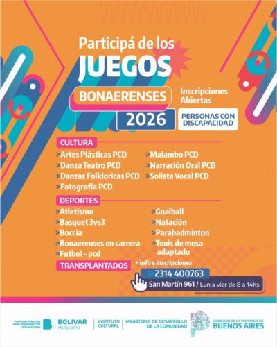 La Municipalidad de Bolívar, a través de la Dirección de Cultura y la Dirección de Deportes, anuncia el inicio del período de inscripciones para los Juegos Bonaerenses 2026, el certamen social, deportivo y cultural más importante de la provincia de Buenos Aires.
