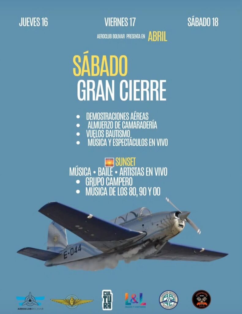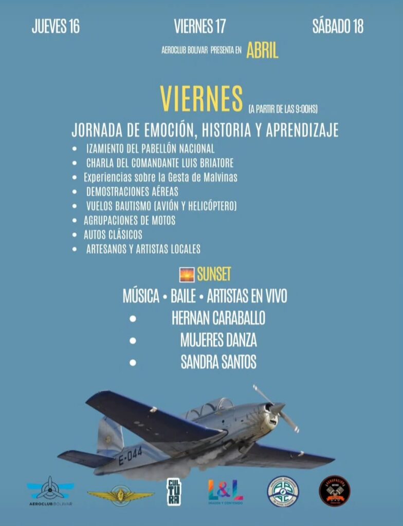 El Aeroclub Bolívar será escenario del evento “Bolívar Vive el Cielo 2026”, que se desarrollará entre el jueves 16 y sábado 18 de abril. La propuesta contará con la participación de la escuadrilla histórica “Defensores de nuestros cielos”, quienes realizarán el mismo jueves un sobrevuelo a toda la ciudad.