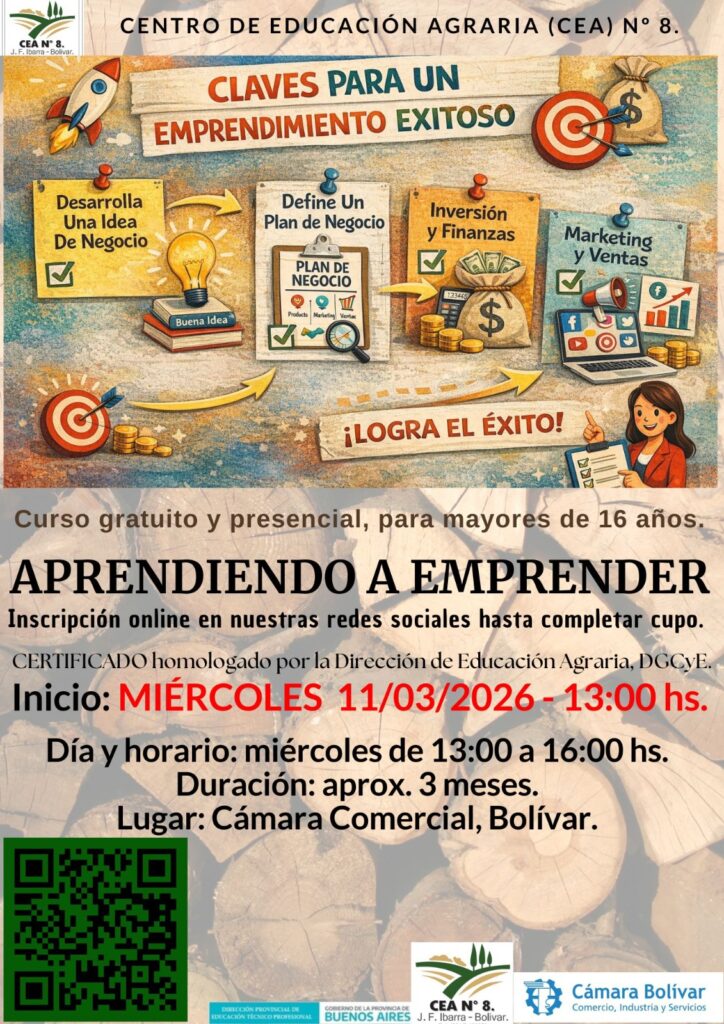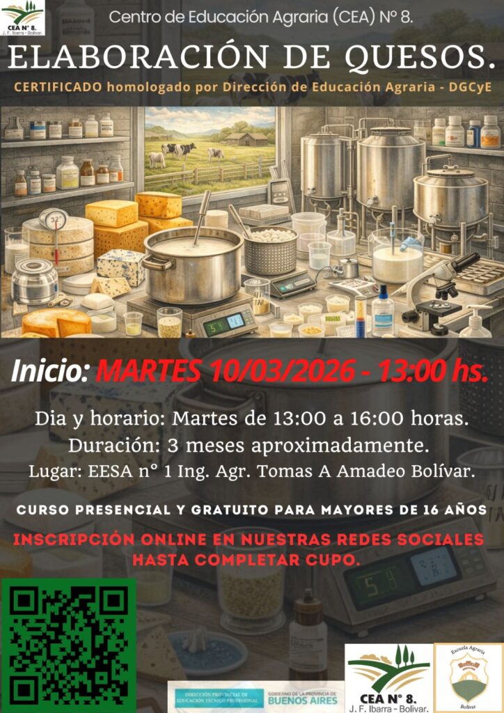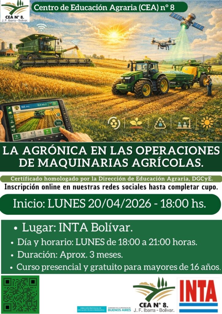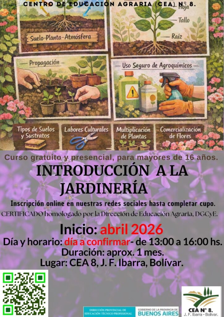 El Centro de Educación Agraria N° 8 (CEA N° 8) de Ibarra abrió la inscripción a una nueva oferta de capacitaciones presenciales, gratuitas y con certificación oficial de la Dirección de Educación Agraria, destinadas a mayores de 16 años. Los cursos cuentan con cupos limitados y comenzarán a dictarse entre marzo y abril de 2026, en distintas sedes del partido de Bolívar.