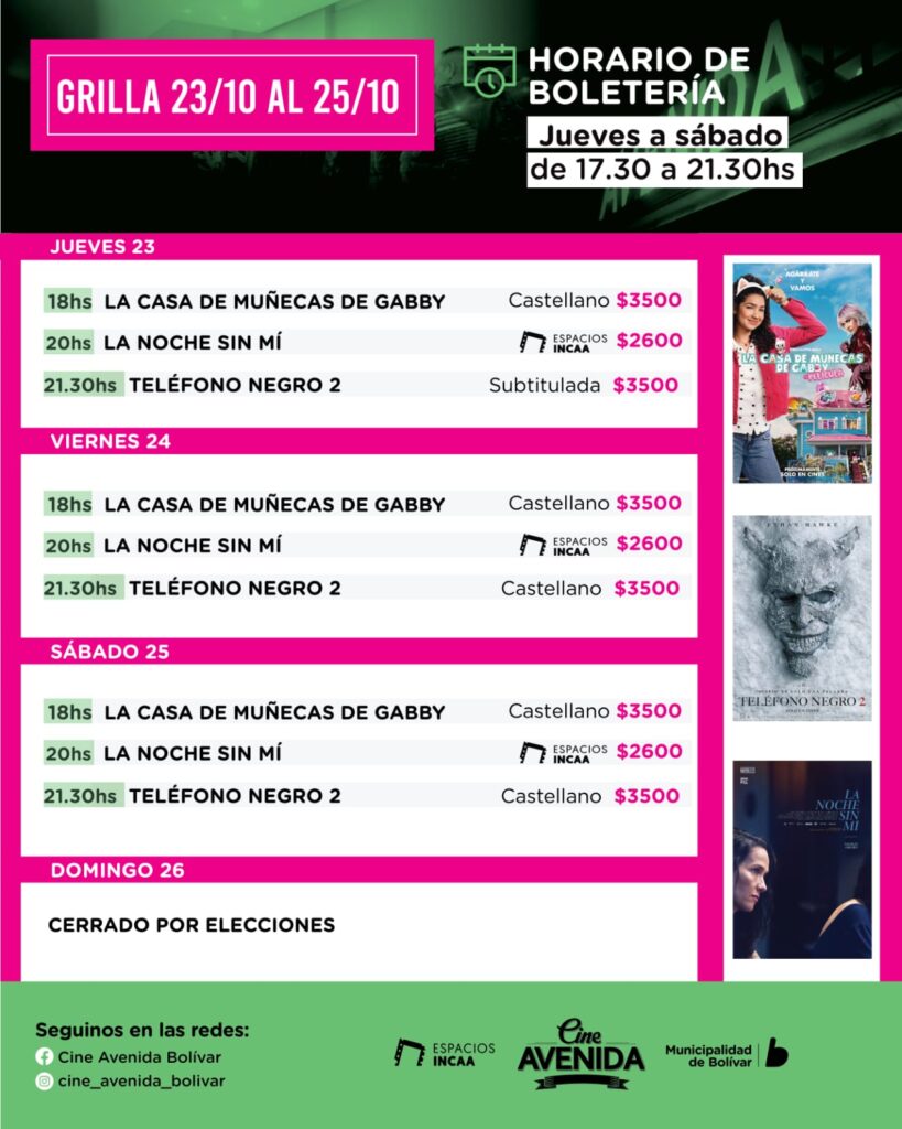 El Cine Avenida de Bolívar presenta su programación para este fin de semana, con funciones desde el jueves 23 hasta el sábado 25 de octubre, ya que el domingo 26 permanecerá cerrado con motivo de las elecciones nacionales. La cartelera combina opciones para toda la familia, con propuestas de animación, comedia romántica y terror.