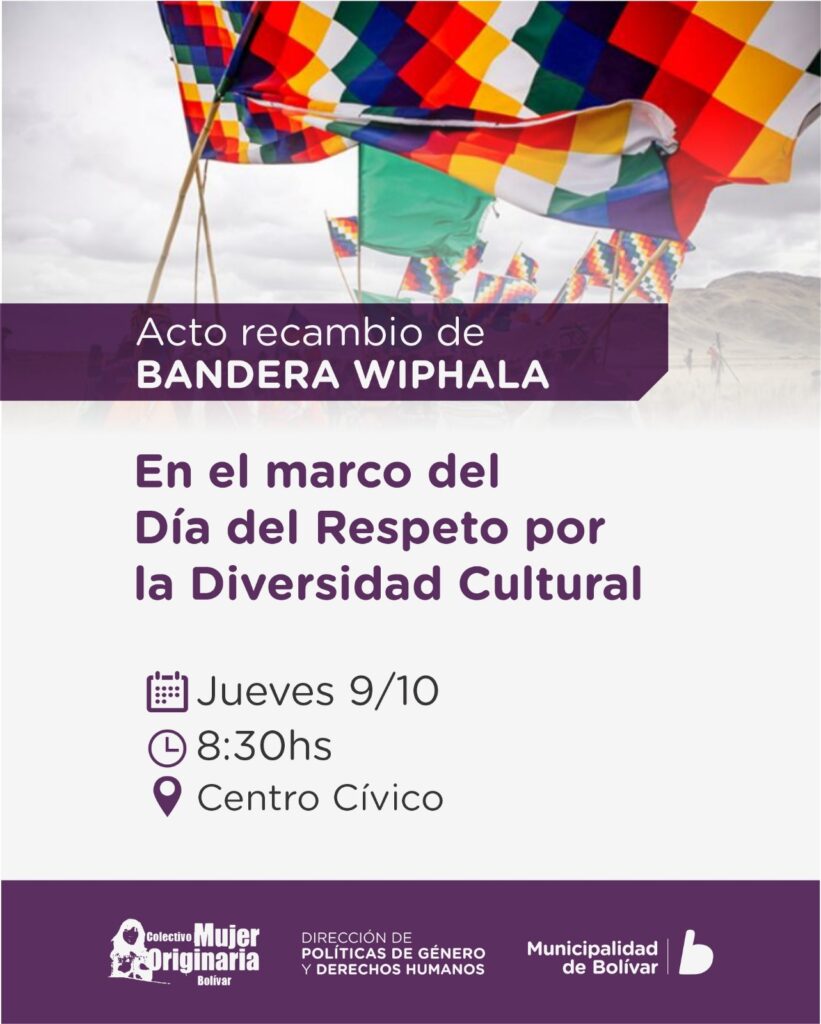 El acto de recambio de la bandera Wiphala se realizará este jueves 9 de octubre a las 8:30 horas en el Centro Cívico (no en la plaza Pueblos Originarios como venía ocurriendo) en el marco del Día del Respeto por la Diversidad Cultural. Se espera presencia de instituciones y referentes de la comunidad.