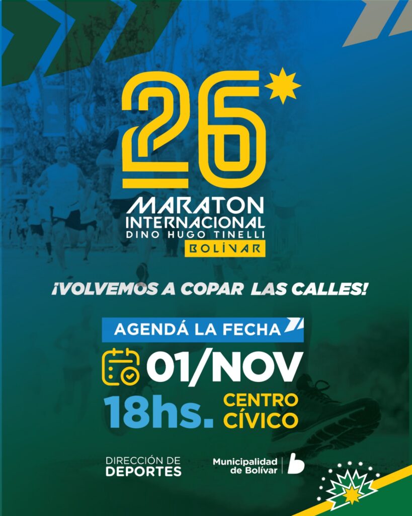 La intendenta interina María Laura Rodríguez confirmó que la tradicional Maratón Dino Hugo Tinelli se correrá el próximo sábado 1 de noviembre, a partir de las 18 hs. En esta 26° edición, la competencia volverá a reunir a una gran cantidad de atletas de Bolívar, la región y distintos puntos del país, consolidándose como una de las fiestas deportivas más importantes de la ciudad.