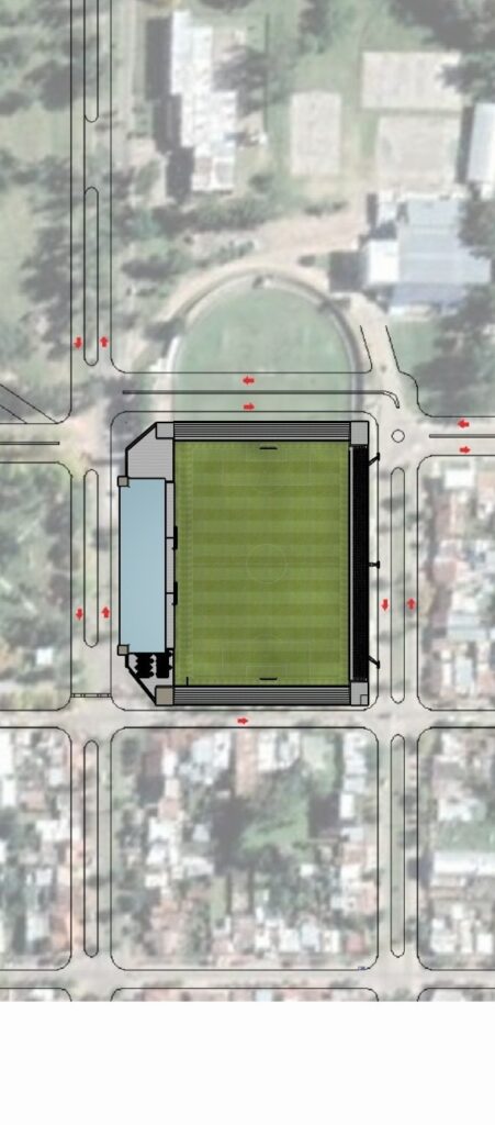 Por último, Sarraúa planificaría una sustancial modificación en la ubicación del Estadio Municipal, corriéndolo casi al límite de la calle Matheu, pero liberando un sector posterior, que permitiría generar una continuidad entre las avenidas Juan Manuel de Rosas y Centenario, hoy separadas por el Estadio.