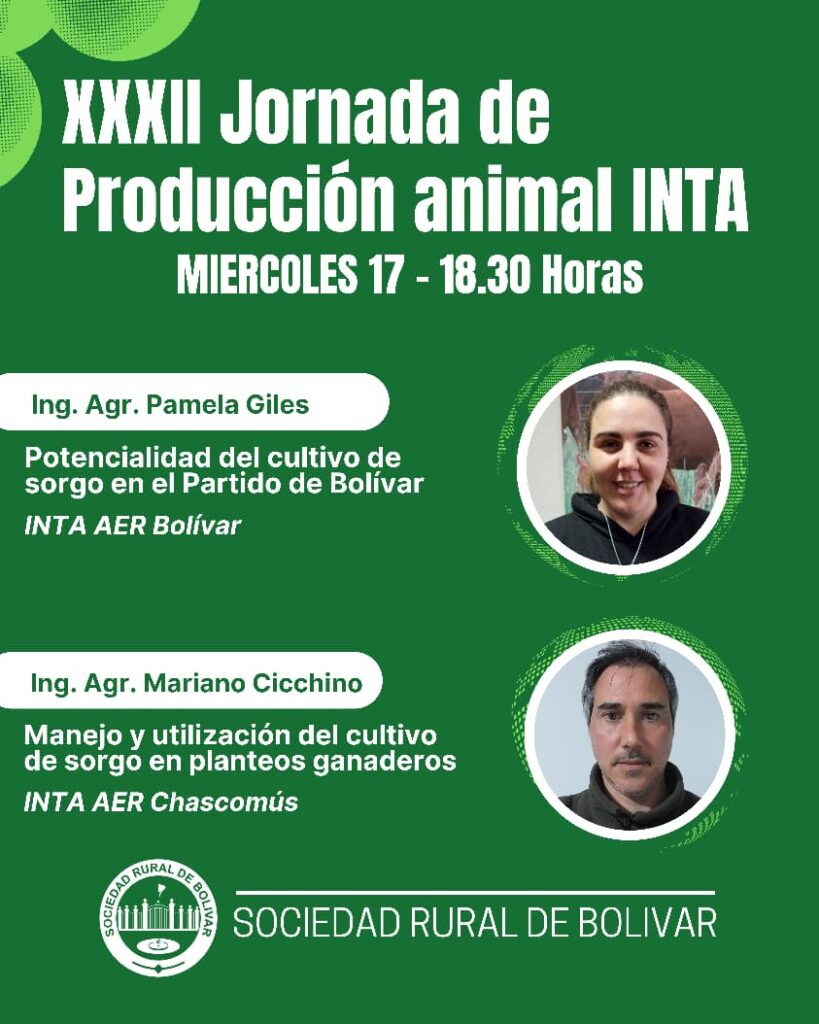 Más tarde, desde las 18.30, se desarrollará la Jornada de Producción Animal de INTA Bolívar, donde la ingeniera agrónoma Pamela Giles abordará la “Potencialidad del cultivo de sorgo en el Partido de Bolívar”. Finalmente, a las 19.15, el ingeniero agrónomo Mariano Cicchino (INTA AER Chascomús) expondrá sobre el “Manejo y utilización del cultivo de sorgo en planteos ganaderos”.