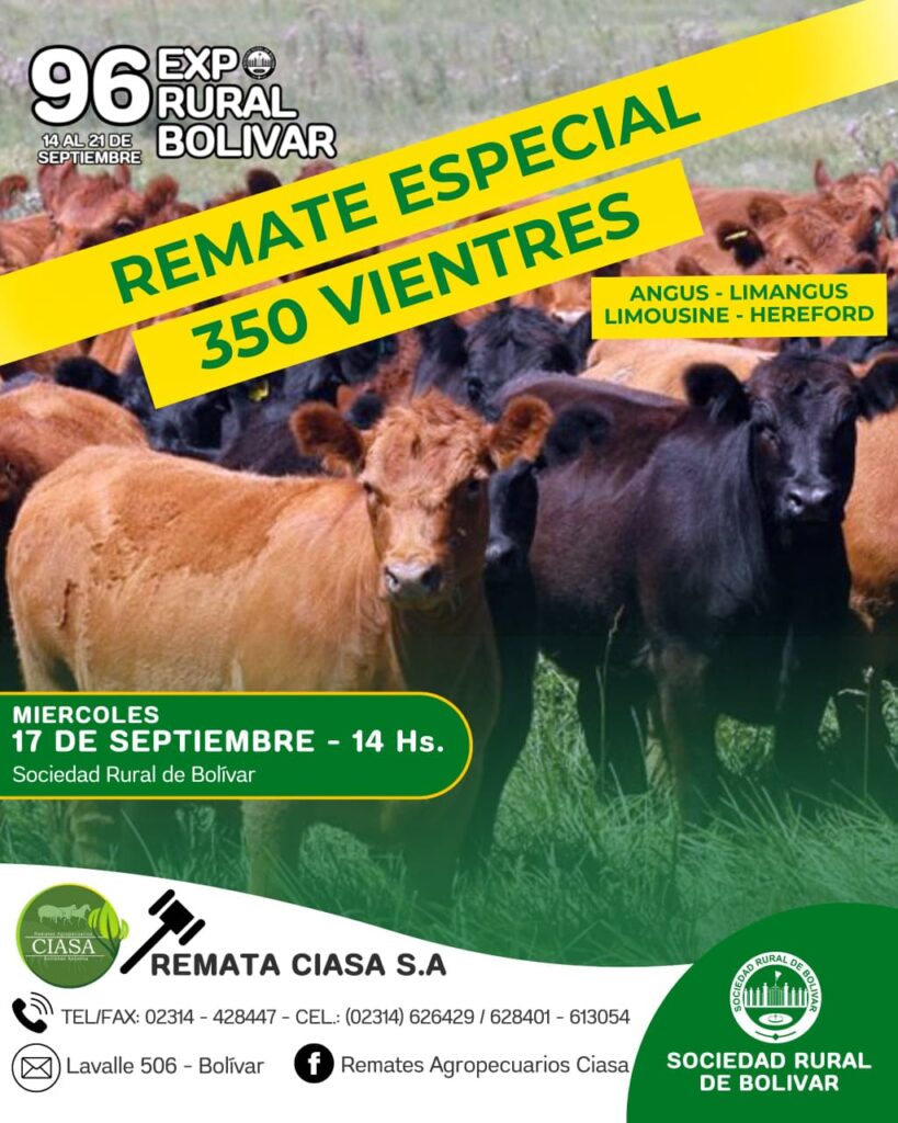 La 96ª Exposición Rural de Bolívar continúa desplegando un cronograma cargado de actividades para todos los públicos. Este miércoles 17 de septiembre, la jornada arranca a las 14 horas con el Remate Especial de Vientres, que pondrá a la venta 350 animales de las razas Angus, Limangus, Limousine y Hereford.