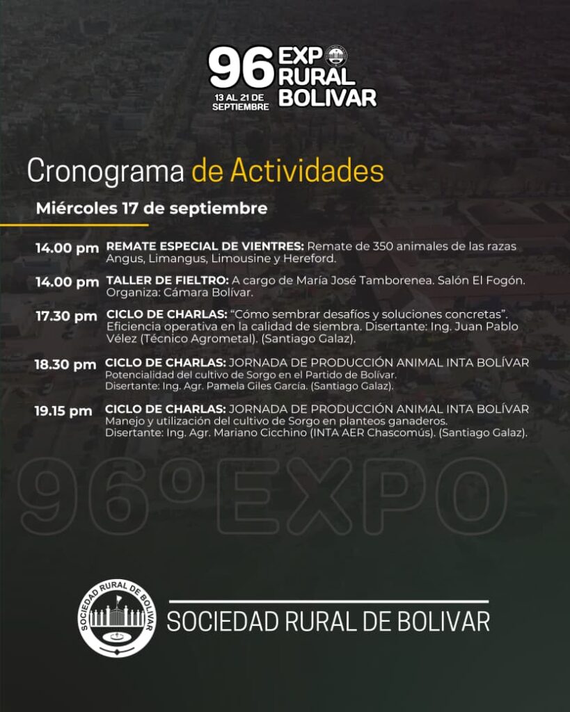 La 96ª Exposición Rural de Bolívar continúa desplegando un cronograma cargado de actividades para todos los públicos. Este miércoles 17 de septiembre, la jornada arranca a las 14 horas con el Remate Especial de Vientres, que pondrá a la venta 350 animales de las razas Angus, Limangus, Limousine y Hereford.