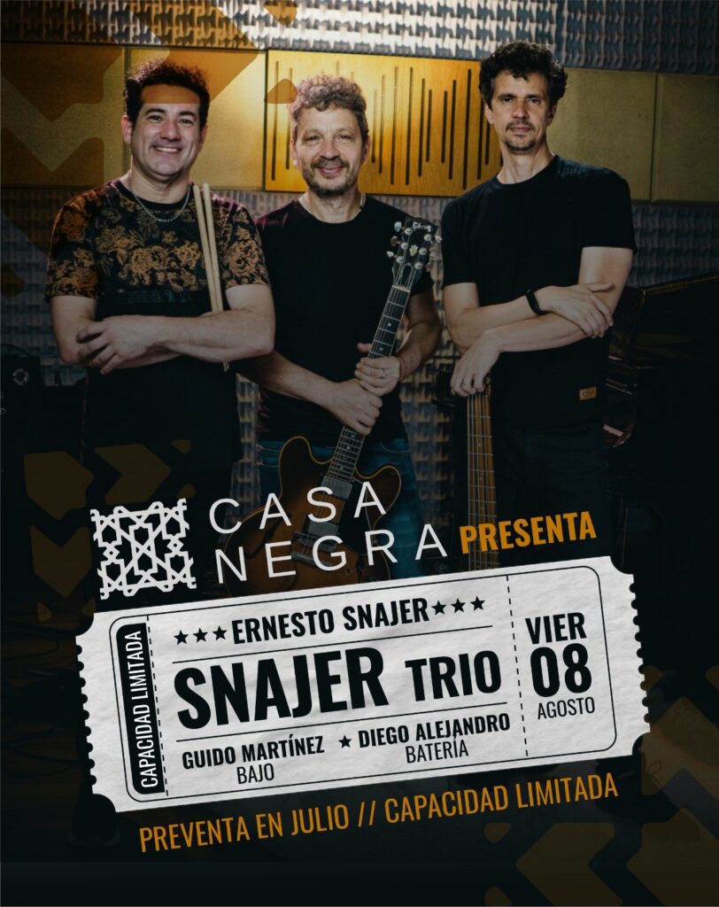 El reconocido guitarrista Ernesto Snajer se presentará este viernes 8 de agosto en Casa Negra, acompañado por Guido Martínez (bajo) y Diego Alejandro (batería), en un formato de trío con el que celebra dos décadas de música compartida y presenta su nuevo disco, “Territorio Eléctrico”.