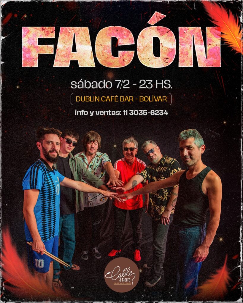 La reconocida banda Facón se presentará en Bolívar el sábado 7 de febrero, a las 23 horas, en Dublin Café Bar, en un show organizado por Cable a Tierra Producciones. La propuesta marcará el regreso del grupo a la ciudad, en el marco de una gira que acompaña la salida de su nuevo disco y que recupera la fusión de folklore y rock que los convirtió en referentes de toda una generación.
