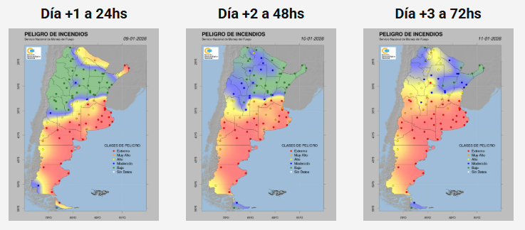 El Servicio Nacional de Manejo del Fuego (SNMF) y el Servicio Meteorológico Nacional (SMN) declararon un “riesgo extremo de incendios” para 16 provincias argentinas y advirtieron que la situación debe considerarse “potencialmente explosiva o extremadamente crítica”. Los mapas difundidos por el SMN muestran a casi toda la franja central y sur del país bajo la categoría más alta de peligro, con especial preocupación en la región pampeana, Cuyo y la Patagonia.