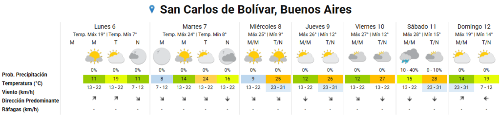 El comienzo de la semana llega con buen tiempo en San Carlos de Bolívar y un progresivo aumento de la temperatura que se mantendrá, al menos, hasta el viernes. Según el Servicio Meteorológico Nacional, no se esperan lluvias en los próximos cinco días y las condiciones serán estables, con jornadas mayormente soleadas y viento leve del cuadrante norte.