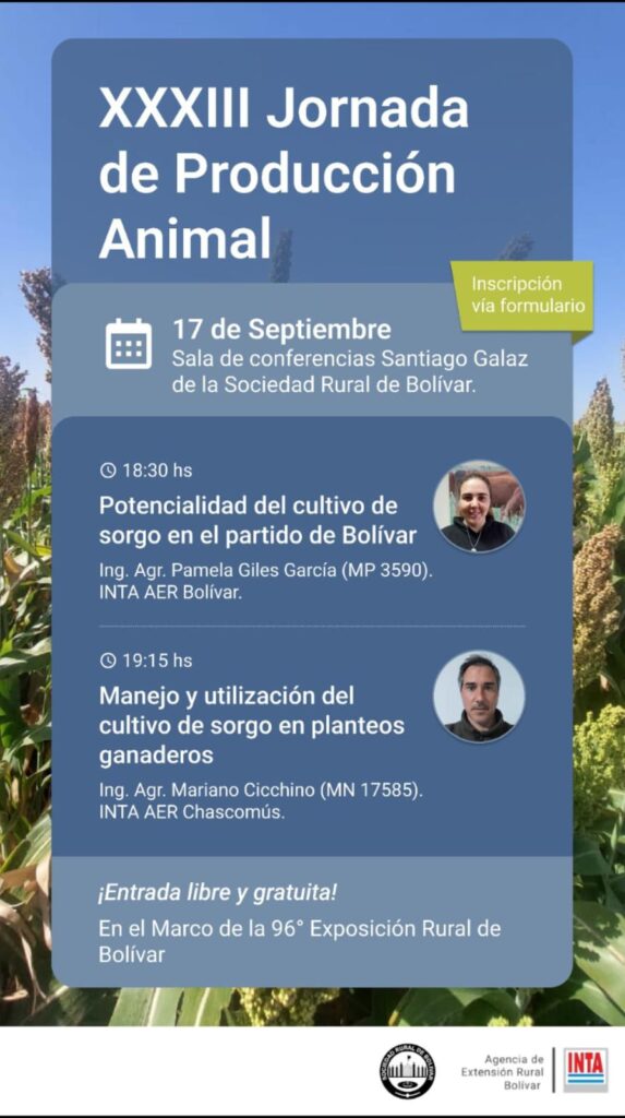 La Agencia INTA Bolívar anunció que este miércoles a las 18:30 realizará su tradicional jornada de producción animal en el marco de la Exposición Rural. Este año, el encuentro estará enfocado exclusivamente en el cultivo de sorgo, un recurso forrajero clave en los planteos ganaderos del partido, y se desarrollará en un momento estratégico de pre-siembra.