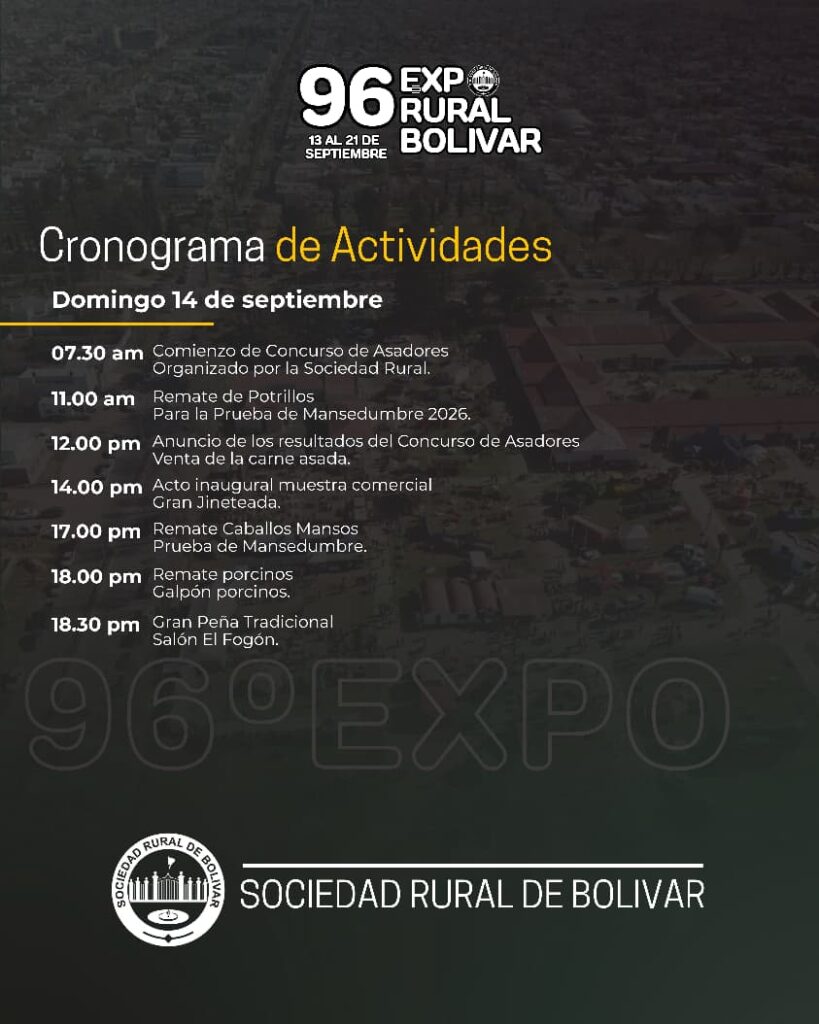 La 96ª Exposición Rural de Bolívar vivió este sábado su jornada inaugural con gran éxito de convocatoria y este domingo promete una agenda cargada de actividades que atraerán nuevamente a miles de visitantes.