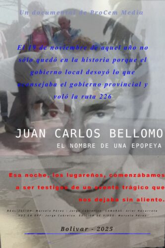El próximo 19 de noviembre, al cumplirse 40 años de la gesta que salvó a Bolívar de la inundación de 1985 y de la tragedia en la que perdió la vida Juan Carlos Bellomo, se estrenará el documental “Juan Carlos Bellomo, el nombre de una epopeya”. La producción estuvo a cargo de Marcelo Pérez, quien asumió los roles de productor, director y realizador, junto a Jorge Cabrerizo, quien además de producir, ejerció como locutor y entrevistador.