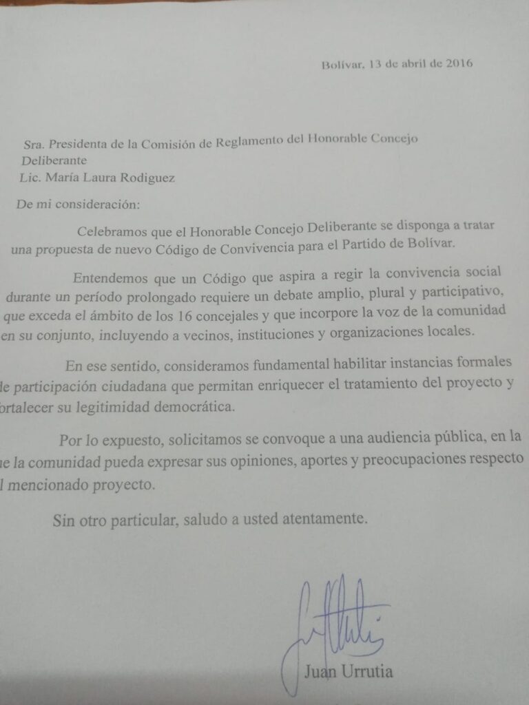 La organización política Patria Grande solicitó formalmente al Honorable Concejo Deliberante de Bolívar la convocatoria a una audiencia pública para debatir el proyecto de Código de Convivencia enviado por el Departamento Ejecutivo. Desde el espacio señalaron que, por su alcance y su impacto en la vida cotidiana, la iniciativa requiere un tratamiento amplio que incorpore la participación de vecinos, instituciones y organizaciones locales.