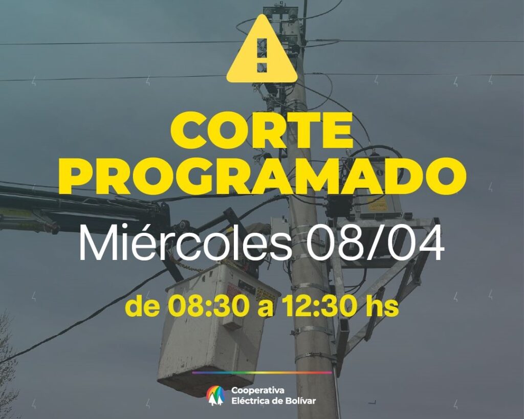 La Cooperativa Eléctrica de Bolívar informó que prevé un corte de energía para este miércoles 08/04 de 08:30 a 12:30 horas. Dicha interrupción de suministro será con el objetivo de llevar adelante tareas de remodelación sub estación ubicada en Av. San Martin y Matheu. En caso de condiciones climáticas adversas, los trabajos serán reprogramados.