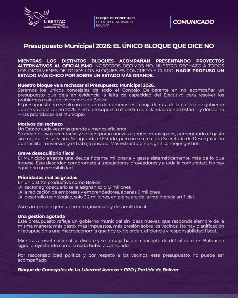 Finalmente, calificaron la gestión como “agotada” y acusaron al gobierno municipal de responder “siempre de la misma manera: más gasto, más impuestos, más presión sobre los vecinos”. En contraste con el enfoque nacional de déficit cero, denunciaron que “en Bolívar se sigue proyectando como si nada hubiera cambiado”. Cerraron el comunicado afirmando: “Por responsabilidad política y por respeto a los vecinos, este presupuesto no puede ser acompañado”.
