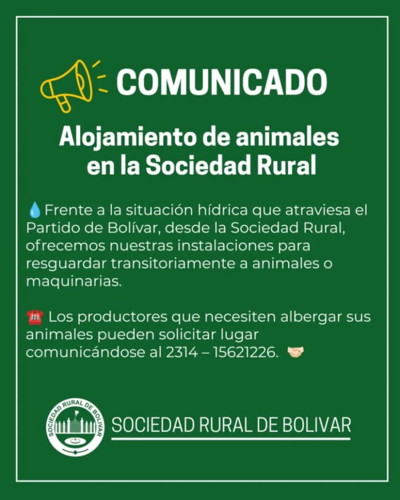 La Sociedad Rural de Bolívar emitió dos comunicados en el marco de la delicada situación hídrica que afecta al partido y a gran parte de la región. Por un lado, ofreció su predio para alojar animales de manera transitoria y, por otro, convocó a los productores a un encuentro en 9 de Julio, del que participarían la ministra Patricia Bullrich y otros dirigentes.