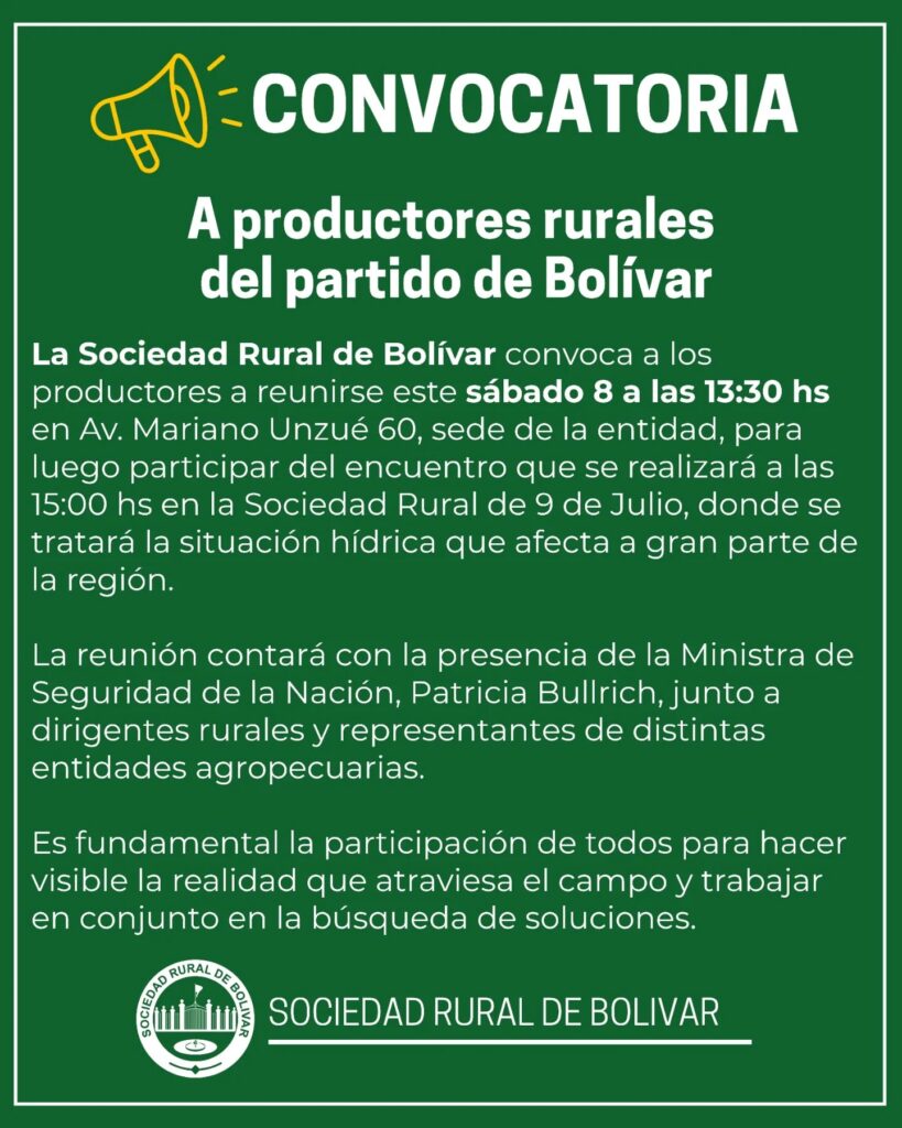 La reunión contará con la presencia de la ministra de Seguridad de la Nación, Patricia Bullrich, junto a dirigentes rurales y representantes de distintas entidades agropecuarias. Desde la Sociedad Rural de Bolívar remarcaron la importancia de la participación de todos los productores para visibilizar la realidad del campo y trabajar en conjunto en la búsqueda de soluciones.
