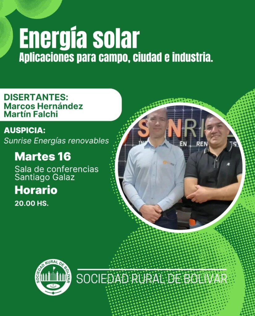 El cierre será a las 20.00, con la charla “Energía solar: aplicaciones para el campo, ciudad e industria”, a cargo de Marcos Hernández, de CIS Centro Integral de Servicios, y Martín Flachi.