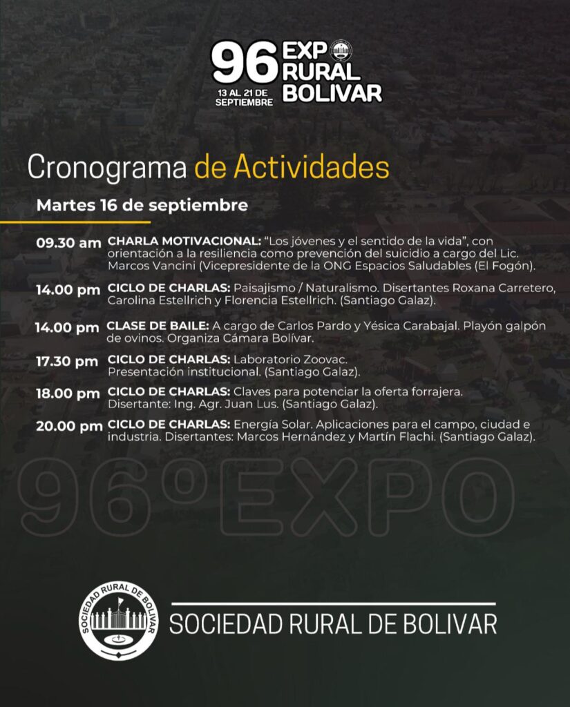 Tras un lunes en el que nuevamente muchísimos vecinos recorrieron el predio ferial, este martes 16 de septiembre la 96ª Exposición Rural de Bolívar ofrece una nutrida agenda de actividades para todos los públicos.