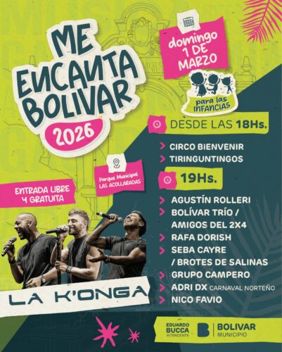 El Municipio confirmó la grilla oficial de las dos jornadas del festival Me EnCanta Bolívar 2026, que se realizará el 28 de febrero y 1 de marzo en el Parque Municipal Las Acollaradas, con entrada libre y gratuita. La selección de artistas estuvo a cargo de la Dirección de Cultura, encabezada por Raúl Chillón, con una propuesta que integra talento local, regional y espectáculos de alcance nacional.