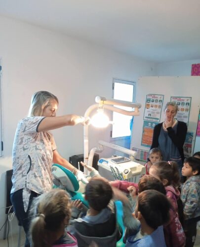 Durante la jornada, la odontóloga Karina Herrero recibió a los niños y niñas en el consultorio odontológico, donde compartió una charla sobre la importancia del cuidado e higiene bucal, mostrando además el espacio de atención para acercarles de manera amigable el ámbito de la salud.