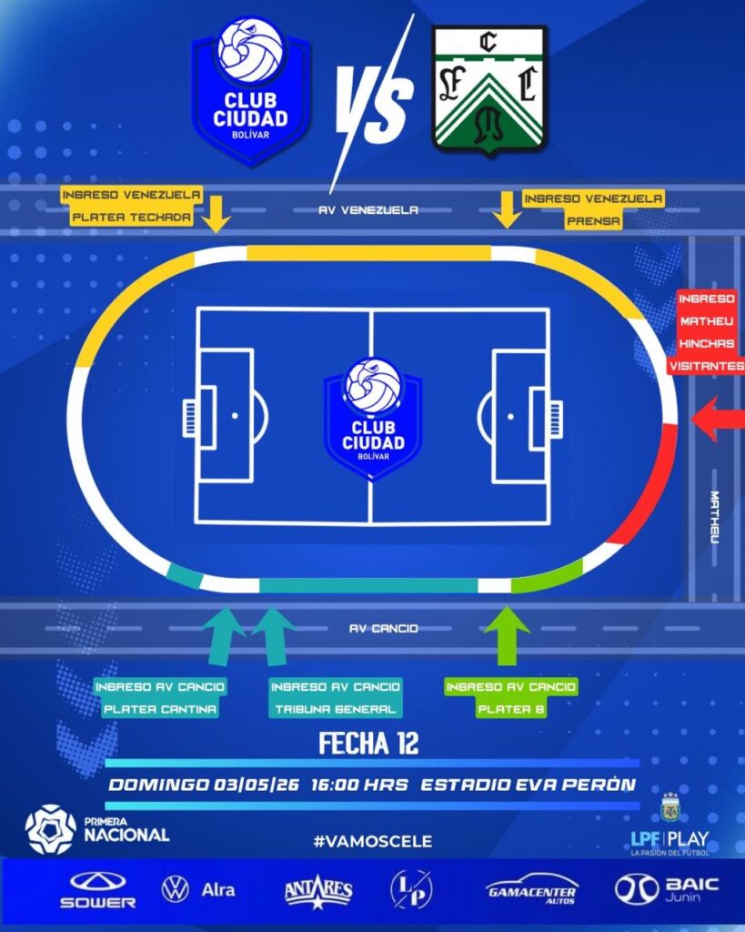 El Ministerio de Seguridad de la provincia de Buenos Aires, a través de la Agencia de Prevención de la Violencia en el Deporte (APreViDe), informó el operativo dispuesto para el partido entre el Club Ciudad de Bolívar y el Club Ferro Carril Oeste, que se disputará este domingo 3 de mayo a las 16 horas en el Estadio Municipal “Eva Perón”. El encuentro contará con alrededor de 120 efectivos policiales, 20 agentes de seguridad privada y servicio médico de emergencias, en el marco de un evento que tendrá la presencia de ambas parcialidades en las tribunas .