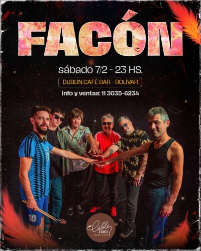 La reconocida banda Facón se presentará en Bolívar el sábado 7 de febrero, a las 23 horas, en Dublin Café...