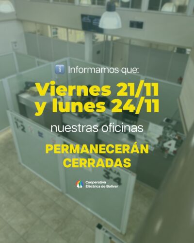 La Cooperativa Eléctrica de Bolívar informó que sus oficinas administrativas permanecerán cerradas el viernes 21 y el lunes 24 de...