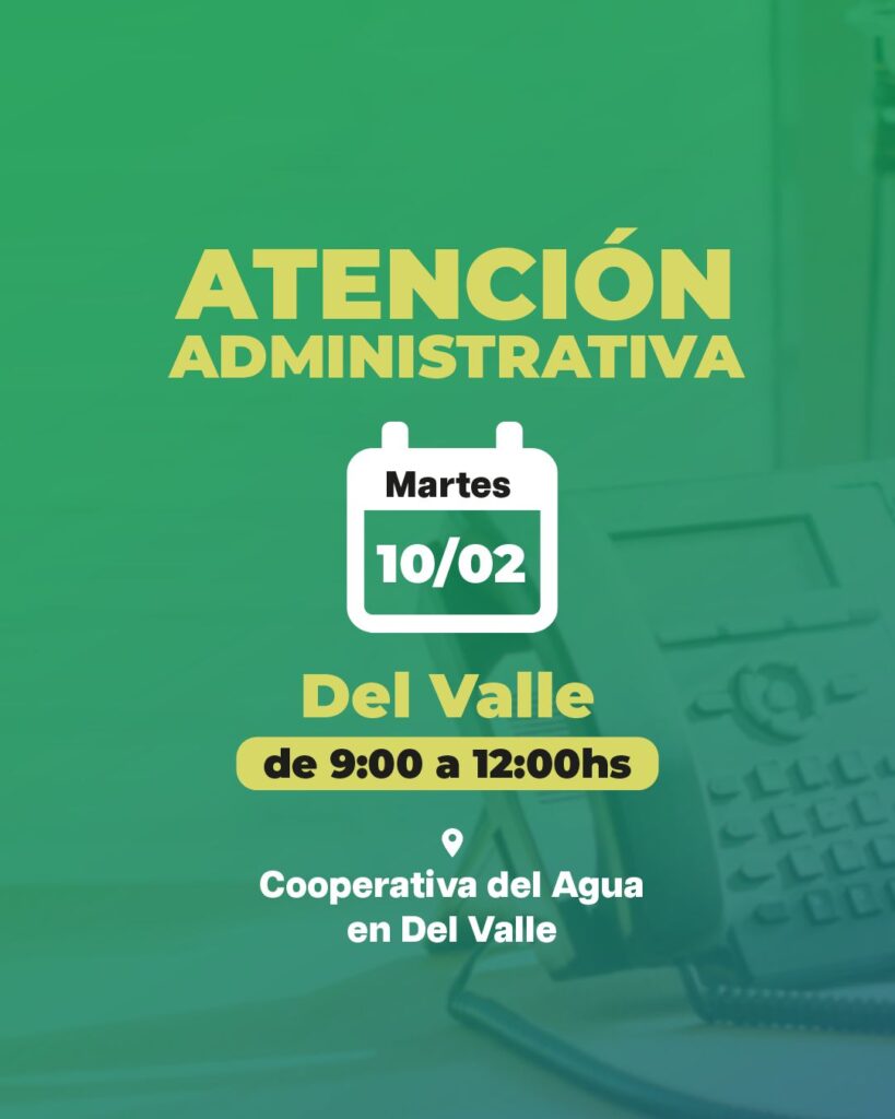 La Cooperativa Eléctrica de Bolívar informó que el próximo martes 10 de febrero su personal administrativo brindará atención en la Cooperativa del Agua, ubicada en la localidad veinticinqueña de Del Valle. La atención se realizará en el horario de 9 a 12 horas, con el objetivo de facilitar a los usuarios la realización de distintos trámites y consultas.