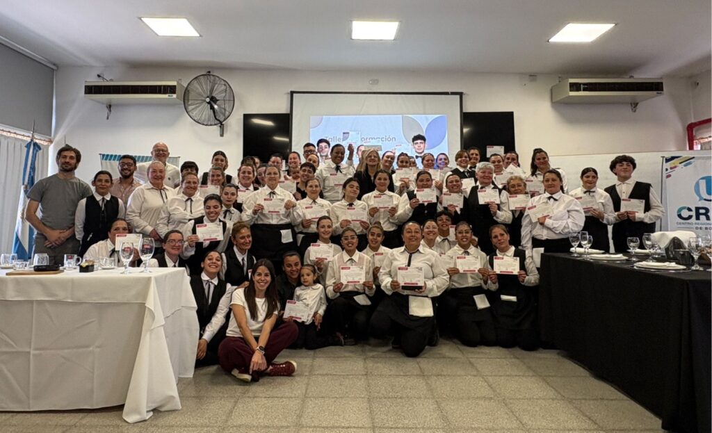 Parte de prensa – Con la entrega de diplomas en el CRUB, 65 personas concluyeron el taller intensivo de mozos y camareras, una propuesta municipal orientada a fortalecer la formación en servicios gastronómicos y responder a la creciente demanda del sector. La intendenta interina María Laura Rodríguez acompañó el acto de finalización del taller, junto al director de Asuntos Agrarios Mariano Sarraúa y al director de Turismo Emilio Leonetti.