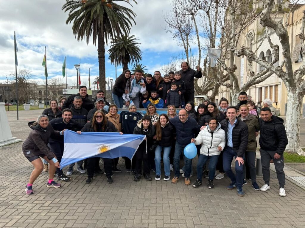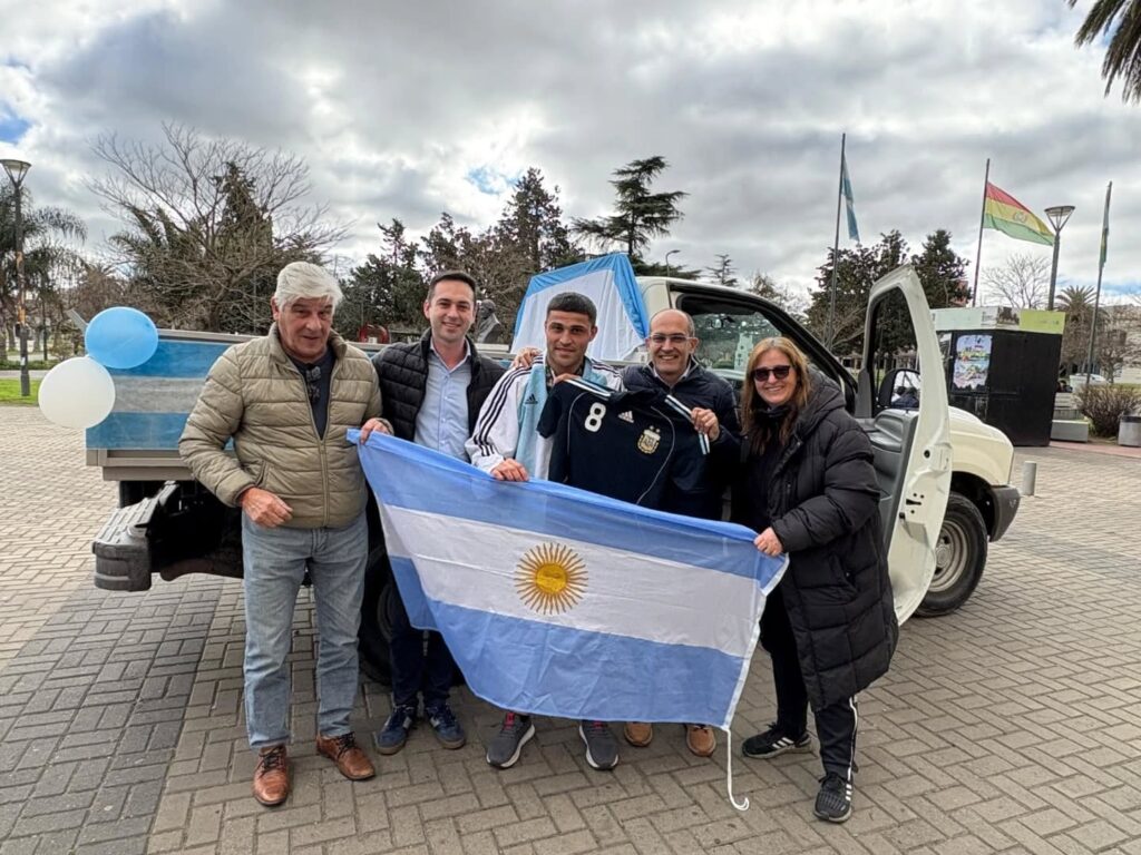 Stampone mostró la medalla que colgaba de su cuello junto a la camiseta argentina, contó que el trofeo mayor quedó en FADDIM y agradeció el acompañamiento. Luego partió en la caja de una camioneta, con varios autos y motos escoltándolos, hacia la Municipalidad, donde fue recibido por el intendente Marcos Pisano.