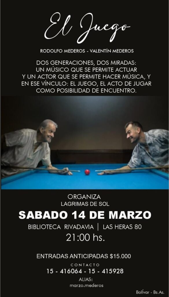 El reconocido bandoneonista Rodolfo Mederos llegará nuevamente a Bolívar, esta vez acompañado por su hijo, el actor y músico Valentín Mederos, para presentar El Juego, una propuesta escénica tan original como emotiva. Música y humor, anécdotas y reflexiones, momentos teatrales y lecturas se entrelazan en un espectáculo difícil de encasillar, que invita a compartir un encuentro íntimo y profundamente humano.