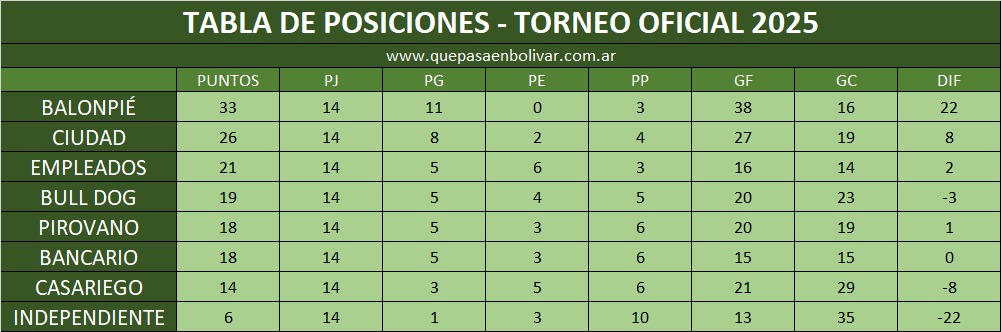 Con la victoria de Empleados 2 a 1 ante Balonpié en cancha de Alem (con goles de Elio Cuello y Nahuel Lavallén; Facundo Iriarte había puesto el empate transitorio), se cerró la etapa clasificatoria del campeonato que organiza la Liga Deportiva de Bolívar. El próximo fin de semana se pondrá en marcha la etapa de play offs.