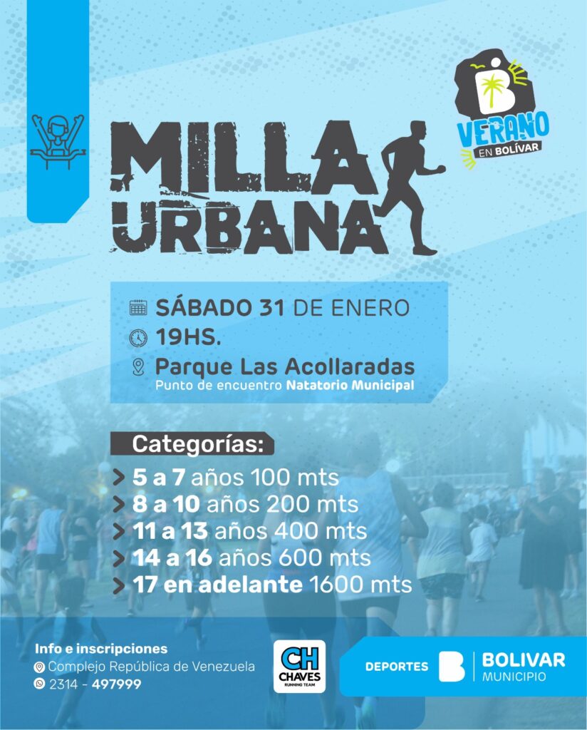 Parte de prensa – En el marco de las propuestas de “Verano en Bolívar”, el Municipio a través de la Dirección de Deportes invita a participar de una nueva edición de la Milla Urbana, una actividad deportiva pensada para promover el movimiento, la vida saludable y el encuentro al aire libre.