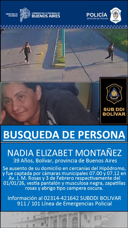 Los efectivos policiales mantienen entrevistas con vecinos, revisan patios, terrenos, casas habitadas y galpones, como así también amplían las labores de visualización y relevamientos de cámaras de seguridad privadas, en búsqueda de la ciudadana Montañez, contando también con la colaboración de personal de Seguridad Vial y Defensa Civil perteneciente a la Dirección de Protección Ciudadana Municipal.